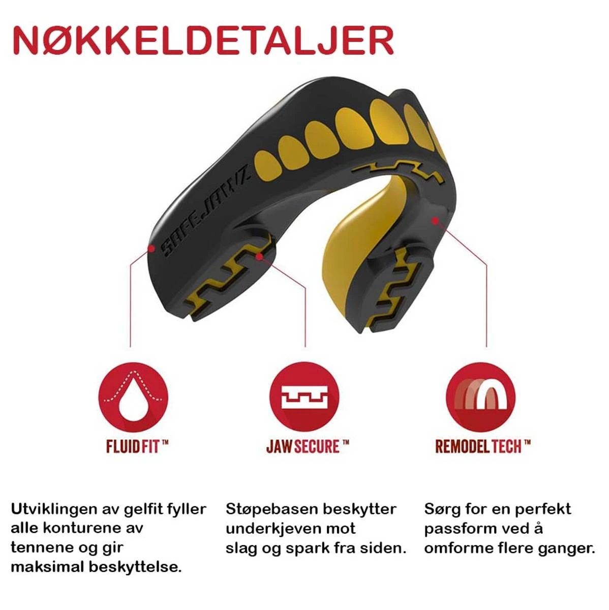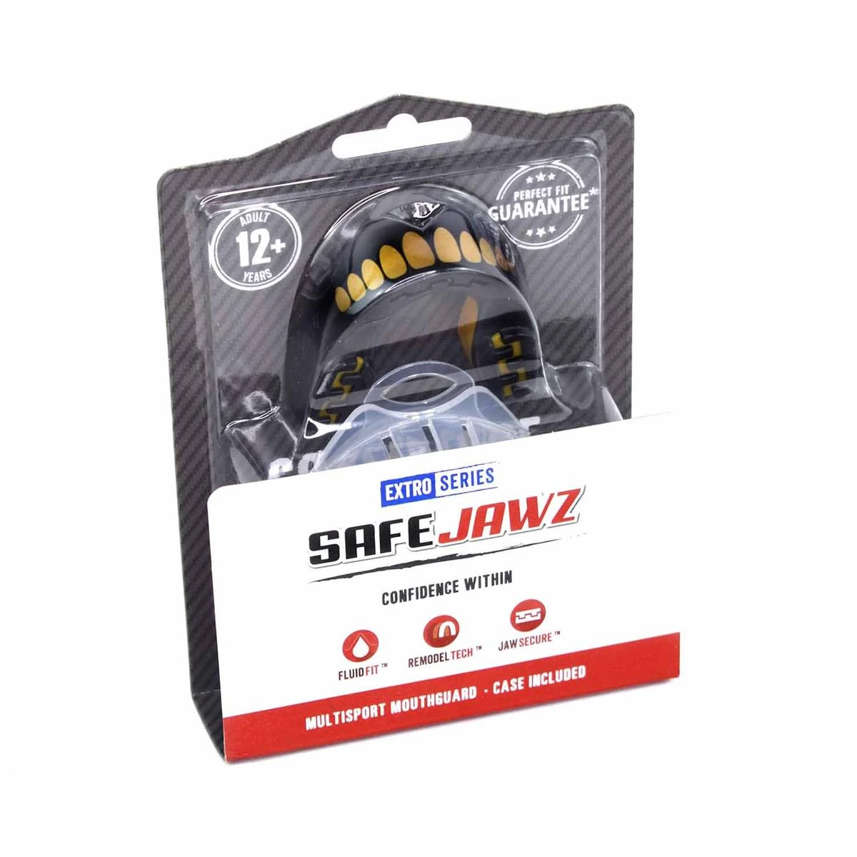 Dette er Fluid Fit ™ -teknologi, som betyr at SAFEJAWZ® beskyttere har en super slank profil og gode retentiske egenskaper. Beskyttelsen vil i hovedsak klemme på tennene og passe komfortabelt slik at pusting, snakk og drikking ikke vil være et problem. Jaw Secure ™ tilbyr også beskyttelse mot kjeve og nedre tenner. Den pre-okkluderte basen og hevde støtfangerputer på bunnen av produktet fungerer som en buffer for å forhindre skade fra støt til underkjeve. Det er ingen kamp for å få en perfekt passform med SAFEJAWZ®. Remodel Tech ™ sikrer at du kan ha flere forsøk på å oppnå den spillskiftende passformen som vi så stolte av. Sist men ikke minst, SAFEJAWZ® Extro-serien har alle et fantastisk design på forsiden. Idrettsutøvere prøver mer og mer å skille seg ut fra sine jevnaldrende og finne nye måter å vise sin personlighet som de utfører. SAFEJAWZ® gir brukerne den friheten – beskyttelse med personlighet.