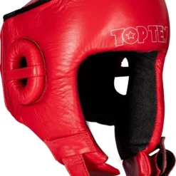 You are “ready to action” with the IFMA head protection “Jarot Muay” from TOP TEN. The head protector with a genuine leather cover meets the safety requirements of the IFMA regulations and bears the association logo on the hook and loop fastener at the back of the head as a seal of confirmation. The skullcap of the “Jarot Muay” head guard is extra secured so that headshots from above cannot throw you off course. For a pleasant view, TOP TEN relies on an unobstructed field of vision for the IFMA head protection. The deep-drawn forehead area well covers the temples. This area is reinforced with a safety ring to prevent external ear injuries. A transverse leather strap prevents painful injuries to the inner ear in the event of direct hits. Two hook and loop straps on the back of the head and one padded hook and loop fastener under the chin ensure a firm hold with individual adjustment options.