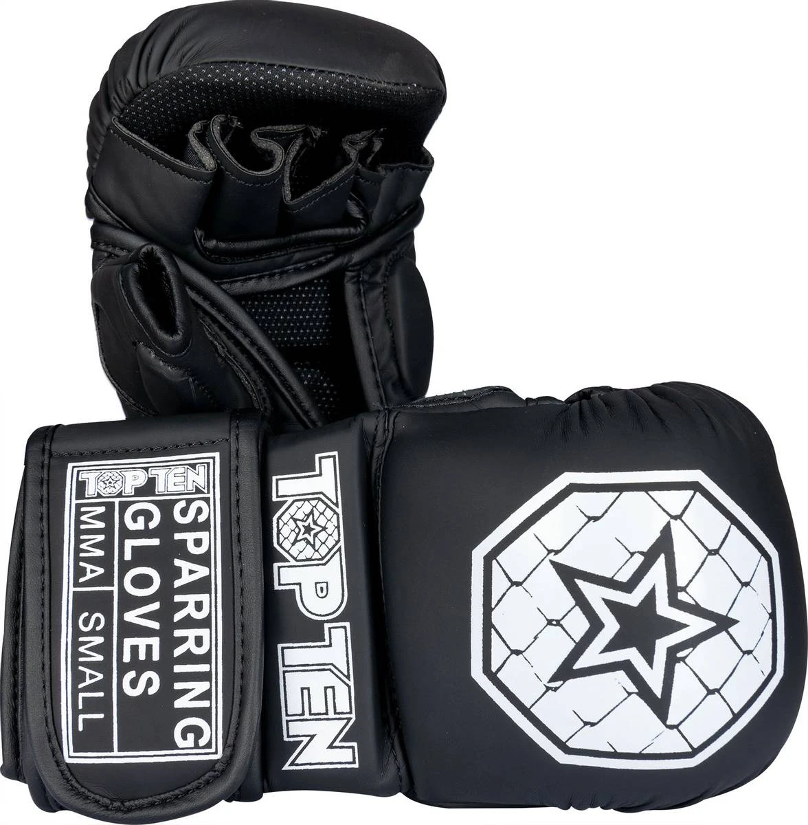 TOP TEN MMA – Contender Sparringshansker – TOP TEN har gjort det igjen. Denne sparringshansken er et must på trening og som skreddersydd til MMA med tanke på design, utforming og egenskaper. TOP TEN MMA Contender sparringshansker kan anbefales med sin høydempede polstring, sine perfekt tilpassende fingerløkker i den semiåpne hansken samt sidepolstring for ekstra beskyttelse for tommelen og utsiden av hånden. Den er ergonomisk utformet for å sitte perfekt på hånda noe som også forsterkes av den doble borrelåsen for ekstra støtte og stabilitet.