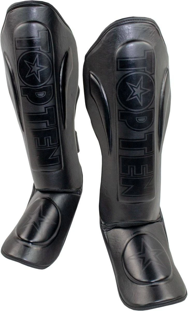 TOP TEN legg- og vristbeskyttere Star Light med den typiske TOP TEN logoen påført i gull på den svarte, holdbare PU-kunstlæroverflaten. På grunn av den ergonomiske utformingen, støtter «Star Light» legg- og vristbeskyttere en nøyaktig fotposisjon. Med lav egenvekt forblir du helt fri til å bevege deg til tross for den høye beskyttelsen til TOP TENS Star Light. Begge komponentene er godt koblet sammen via en fleksibel beskyttelsesleppe. Hardhetsgraden til polstringen oppfattes som svært samtidigsom den gir maks beskyttelse. For en tett passform på benet lukkes «Star Light»-leggbeskytteren med strekkbeskyttelse med krok- og løkke feste i borrelås. I tillegg gir elastiske bånd på hæl og tåball et sklisikkert grep.